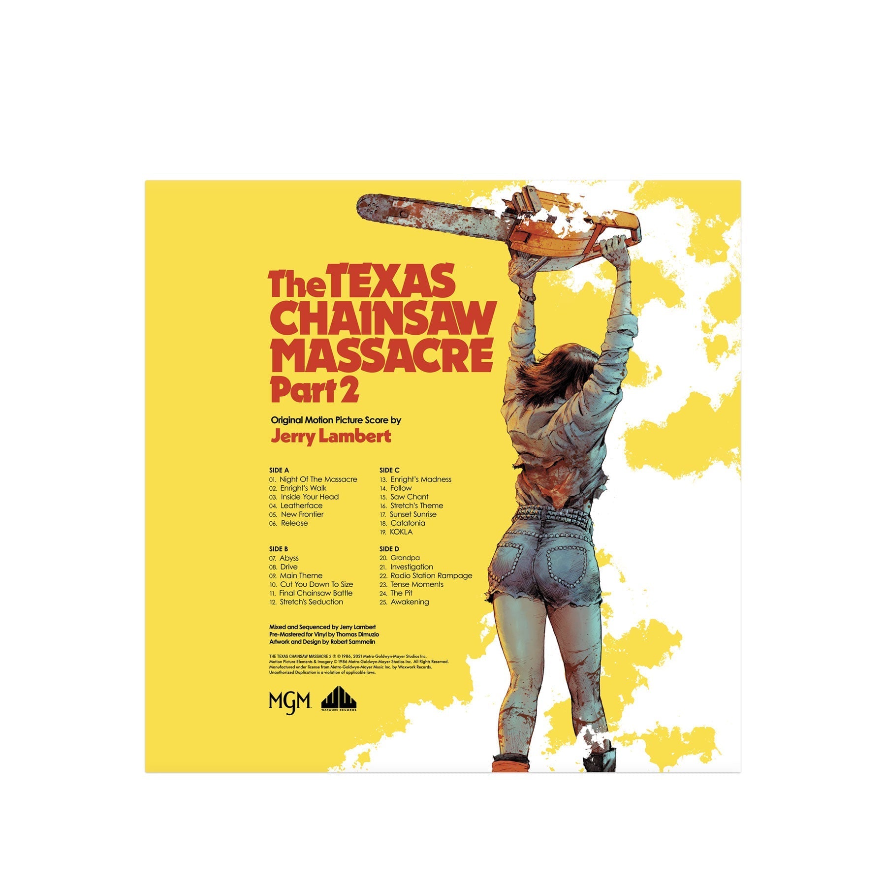 Waxwork Records is excited to present the official TEXAS CHAINSAW MASSACRE PART 2 score with 180 gram "Chainsaw Blade and Blood" colored vinyl, deluxe packaging, composer liner notes by Jerry Lambert, new artwork by Robert Sammelin, heavyweight gatefold jackets with matte satin coating, a 12"x12" art print, and more! "Dog Will Hunt!"